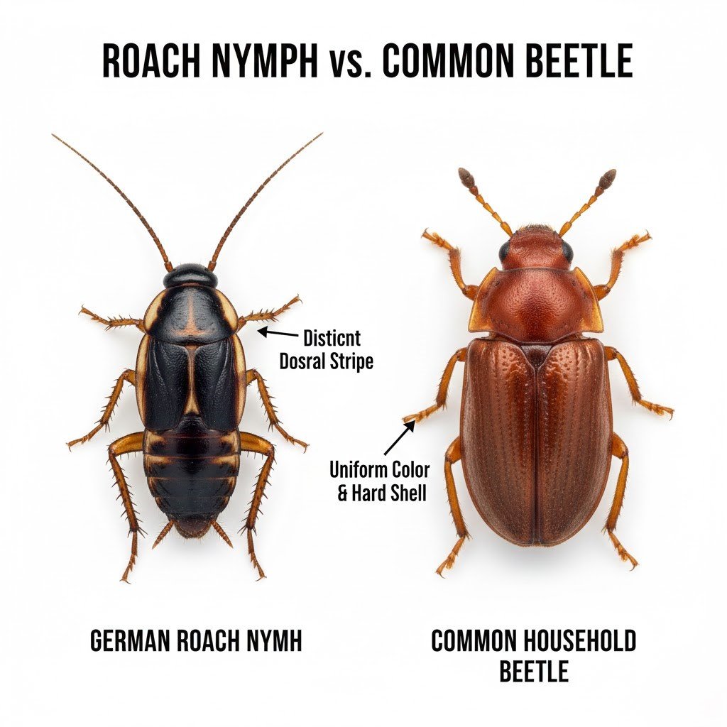• German Cockroach Nymphs: These are the most common indoor pests. They are dark with a distinct light stripe running down their backs. If you see these in a kitchen or bathroom, you have an active infestation.